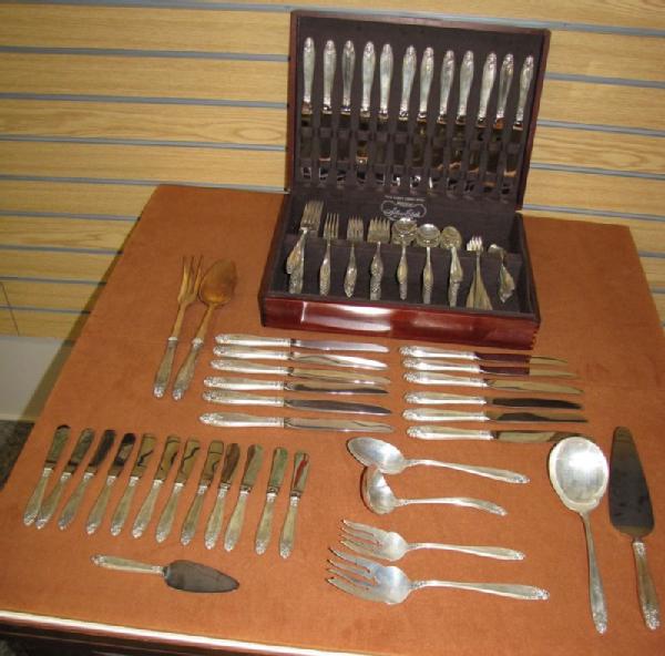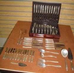 International sterling silver flatware, Prelude pattern, service for 12 plus serving pieces including 12 dinner forks (8"L) with a combined approximate weight of 706 grams; 12 forks (7"L) with a combined approximate weight of 605 grams; 12 salad forks with a combined approximate weight of 432 grams; 24 teaspoons with a combined approximate weight of 748 grams; 12 soup spoons with a combined approximate weight of 439 grams; 12 small forks with a combined approximate weight of 209 grams; 12 small spoons with a combined approximate weight of 130 grams; a 9.5"L serving spoon with an approximate weight of 107 grams; an 8.25"L serving spoon with an approximate weight of 63 grams; a small ladle with an approximate weight of 59 grams; a 9"L serving fork with an approximate weight of 86 grams; a 7.75"L serving fork with an approximate weight of 56 grams; 24 dinner knives with weighted sterling handles; a cake knife with a weighted sterling handle; 12 butter knives with weighted sterling handles; 1 master butter knife with a weighted sterling handle; sterling handled wooden salad fork and spoon set.