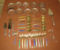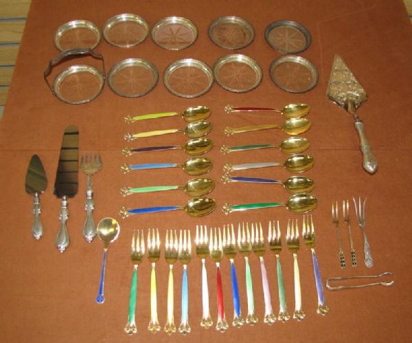 Marked sterling silver items including 12 enamel on sterling forks marked T.H. Marthinsen Norway with combined weight of approximately 318 grams; 12 enamel on sterling spoons marked T.H. Marthinsen Norway with combined weight of approximately 323 grams; 3 enamel on sterling pieces (2 sm. forks and blue spoon) marked David Andersen Norway with a combined weight of approximately 39 grams; vintage sterling sugar tongs and small fork with a combined approximate weight of 39 grams; Italian cake knife with sterling handle; 3 small English serving pieces with sterling handles; 10 glass coasters with sterling rims.