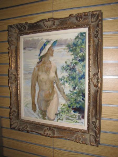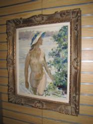 Albert Werner (German 20th c.) signed framed oil on canvas painting of nude woman in lake 19.5"Tx15.5"W