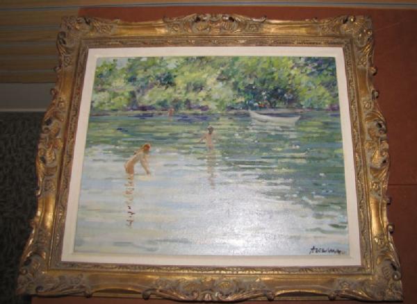 Albert Werner (German 20th c.) signed framed oil on canvas painting of nude women in lake 15.5"Tx19.5"W
