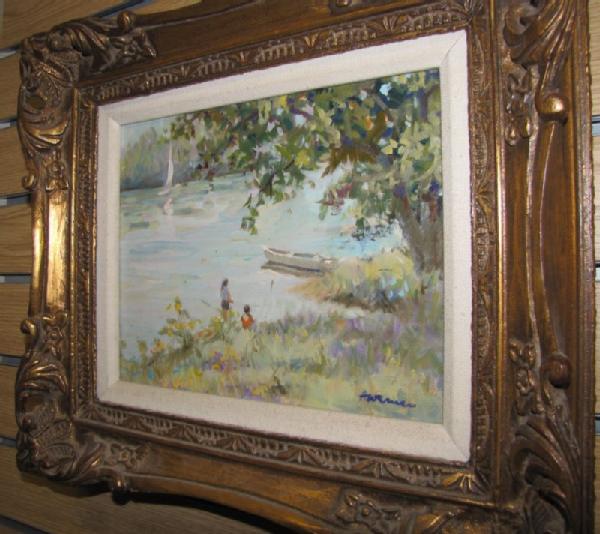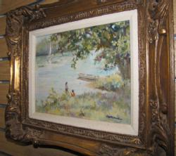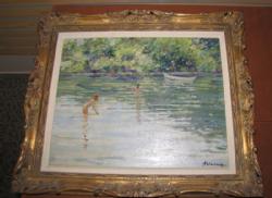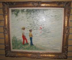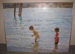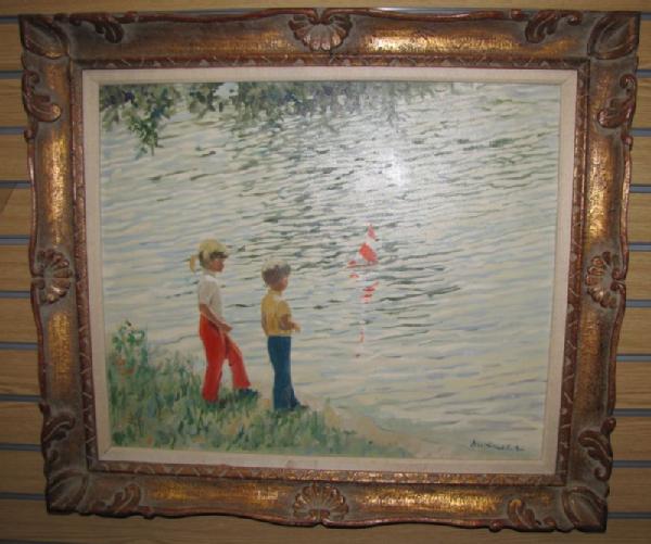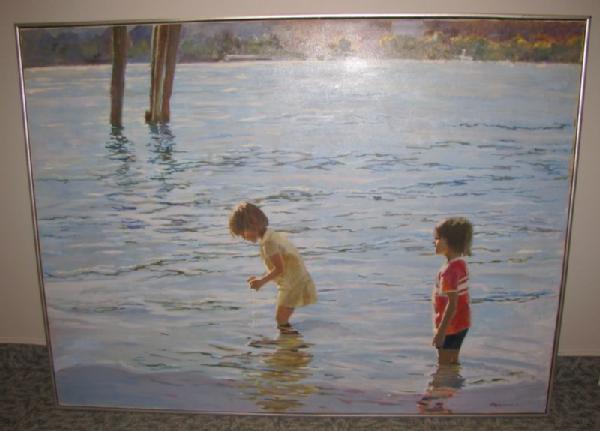 Albert Werner (German 20th c.) signed framed oil on canvas painting of two children standing in a lake 37"Tx48"W.