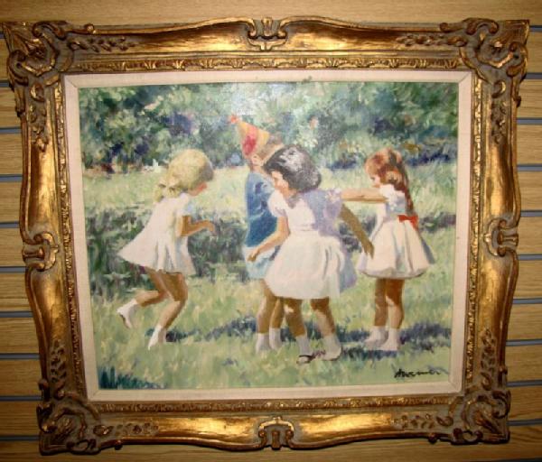 Albert Werner (German 20th c.) signed framed oil on canvas painting of children at play 19.5"Tx23.5"W.