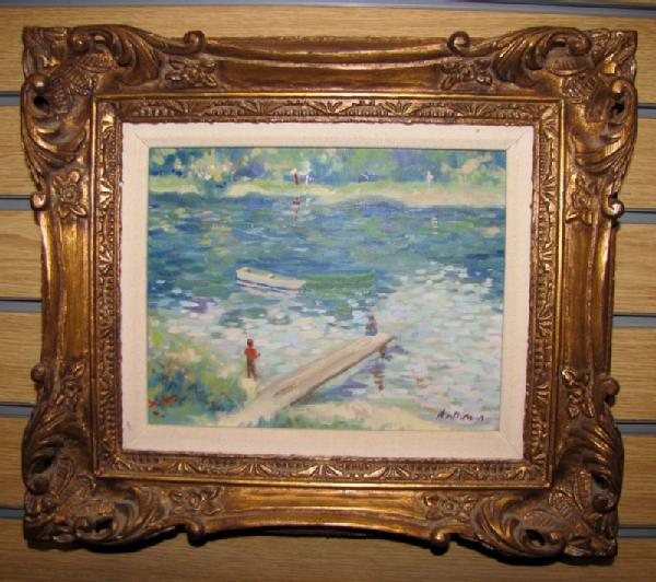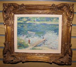 Albert Werner (German 20th c.) signed framed oil on canvas painting of two children on lake shore 7.5"Tx9.5"W
