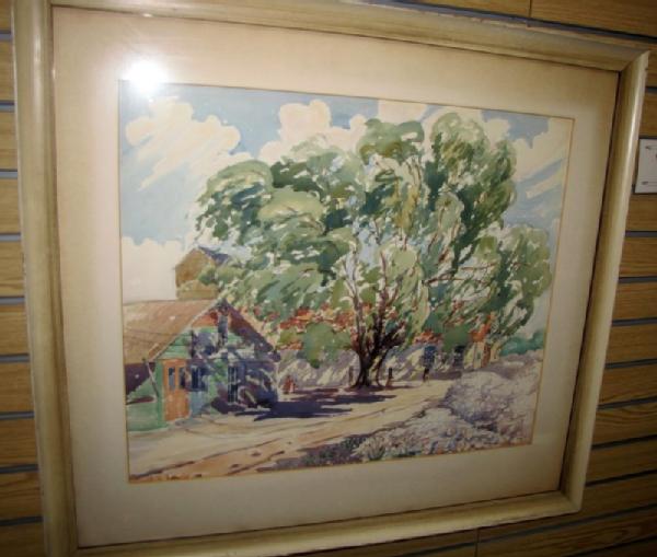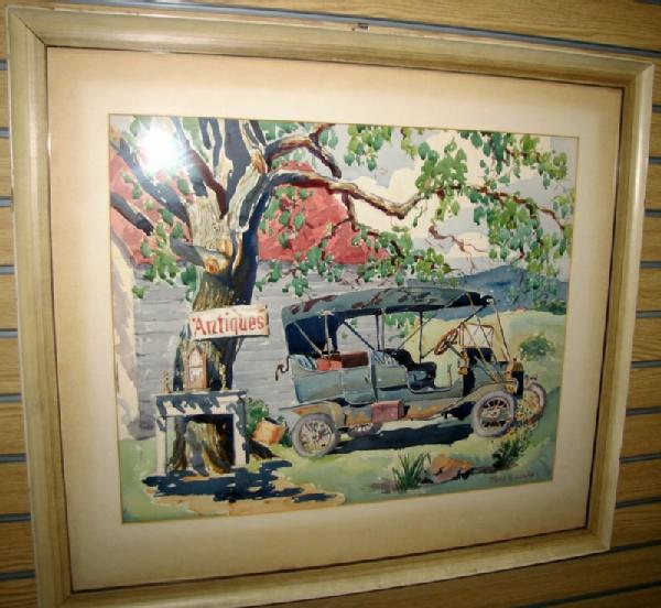Cyril A. Lewis (NY 1903-1994) signed watercolor painting of vintage car and antiques sign 19.5"Tx23.5"W. Older frame and mat. Label verso indicates it was part of an art show in 1939.