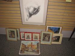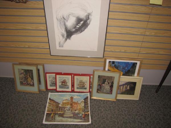 Artwork including 17"Tx20"W oil on canvas painting (unframed) signed Michel; 22"Tx17"W signed and framed Italian lithograph; 3 framed vintage French fashion prints; 5 framed ship prints; etc.