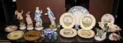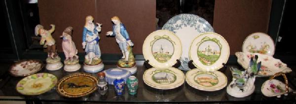 Porcelain items including 4 romantic porcelain figurines (8" - 9"T) possibly French; 4.5"T bird figurine marked Kunstporzellen; 6 Longchamp French plates ea. 6.5"W; Wedgwood lidded dresser box; enamel on brass bull jumping plate; 9.5"W Hammersley bone china bowl; 10" etc. Ruskin Colonial Pottery plate