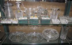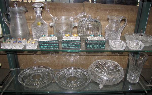 Crystal and glass items including 3 sets of Norway Crown Jewelry crystal salt/pepper shakers with enamel tops; 6 sets of small crystal salt/pepper shakers with enamel tops; Bayel lead crystal decanter from France; ice bucket with etched golf design; lidded pumpkin canister; two water pitchers; 9.25"T SamObor Kristel vase made in Croatia; 11"W crystal footed bowl (chip on inside rim); 3 divided glass serving pieces, etc.