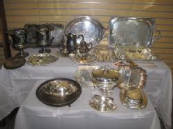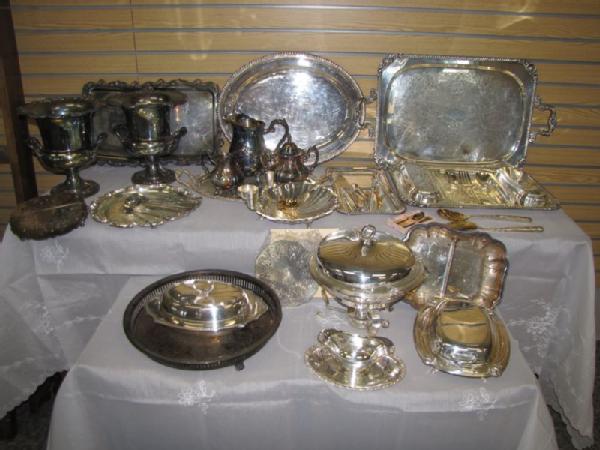 Large lot of silver-plated items including 2 wine buckets (golf trophies) with aluminum liners; large English platters; trays; serving pieces; flatware; etc.