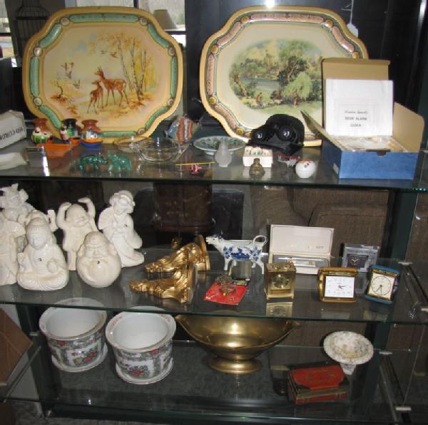 Misc. items including vintage alarm clocks; new Linden Quartz desk clock; various miniature items; two English tole trays; brass vase; two Chinese porcelain vases; 7 Benihanna pottery mugs; Delft cow creamer; 3 vintage Playboy Club ashtrays; German cigarette lighter; modern binoculars; etc.