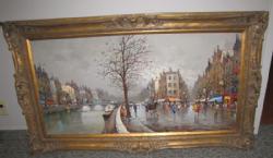 24"Tx48"W framed oil on canvas painting signed Camillo of a European street scene along a river.