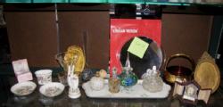Dresser items including 3 crystal perfume bottles; perfume atomizer made in Germany in U.S. Zone; Limoges porcelain dresser tray; Lefton china ring holder; 2 small brass picture frames; vintage Rolomax Watch Co. Swiss clock 2.5"T in leather case (some mother of pearl panel off on back and side); gold panted cranberry glass basket; Lillian Vernon enlarging mirror; etc.