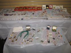 Misc. costume jewelry & ornaments including numerous glass and crystal necklaces; strings of green stones labeled Malakite rondel; vintage cufflinks; Trifari brooches in boxes; faux pearls; rhinestone items; Liz & Co. ornaments; etc.