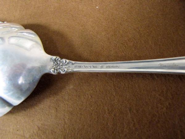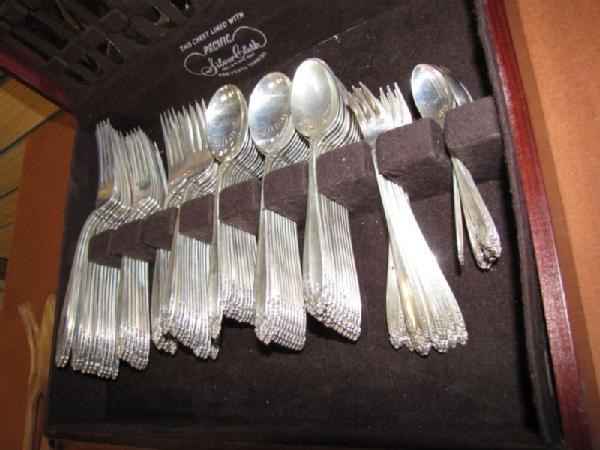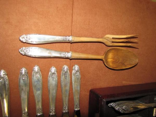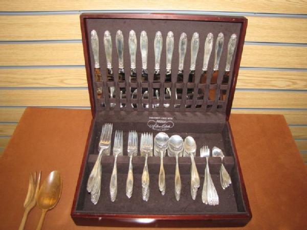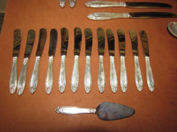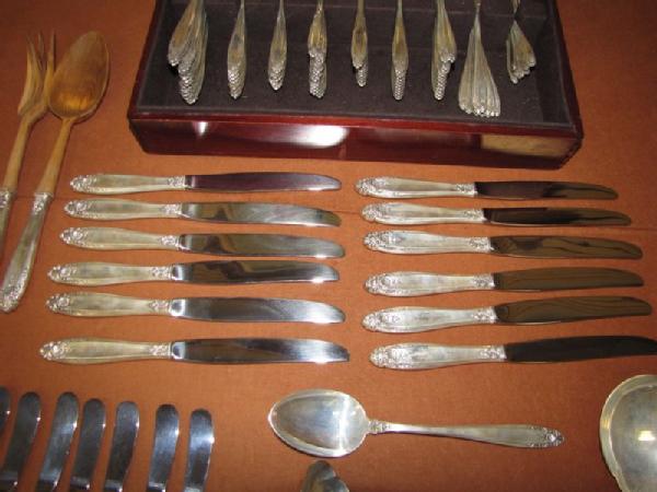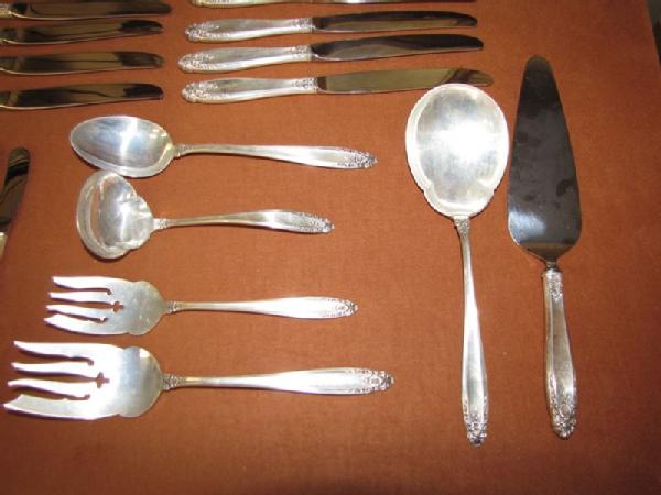 International sterling silver flatware, Prelude pattern, service for 12 plus serving pieces including 12 dinner forks (8"L) with a combined approximate weight of 706 grams; 12 forks (7"L) with a combined approximate weight of 605 grams; 12 salad forks with a combined approximate weight of 432 grams; 24 teaspoons with a combined approximate weight of 748 grams; 12 soup spoons with a combined approximate weight of 439 grams; 12 small forks with a combined approximate weight of 209 grams; 12 small spoons with a combined approximate weight of 130 grams; a 9.5"L serving spoon with an approximate weight of 107 grams; an 8.25"L serving spoon with an approximate weight of 63 grams; a small ladle with an approximate weight of 59 grams; a 9"L serving fork with an approximate weight of 86 grams; a 7.75"L serving fork with an approximate weight of 56 grams; 24 dinner knives with weighted sterling handles; a cake knife with a weighted sterling handle; 12 butter knives with weighted sterling handles; 1 master butter knife with a weighted sterling handle; sterling handled wooden salad fork and spoon set.