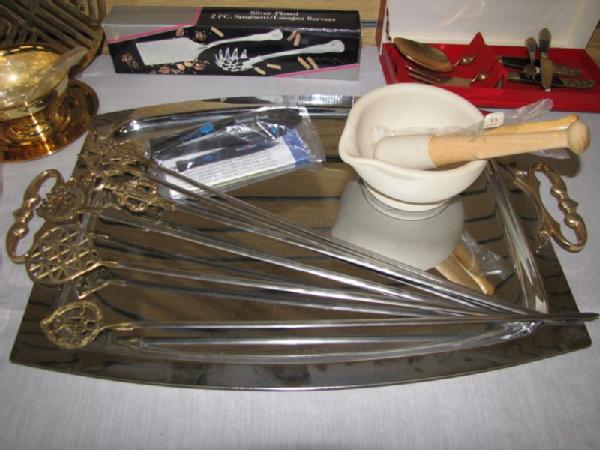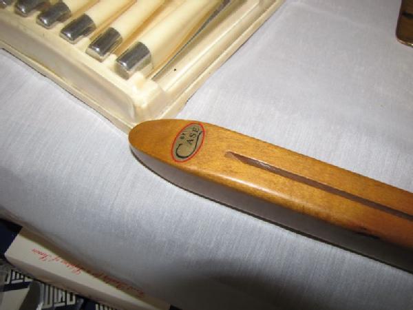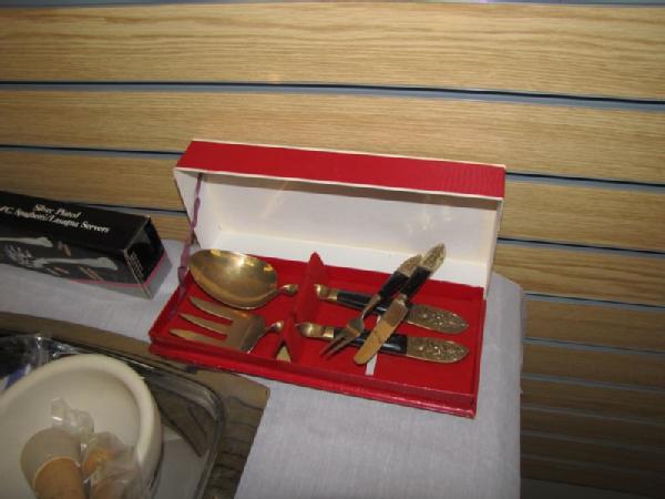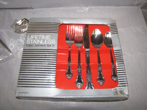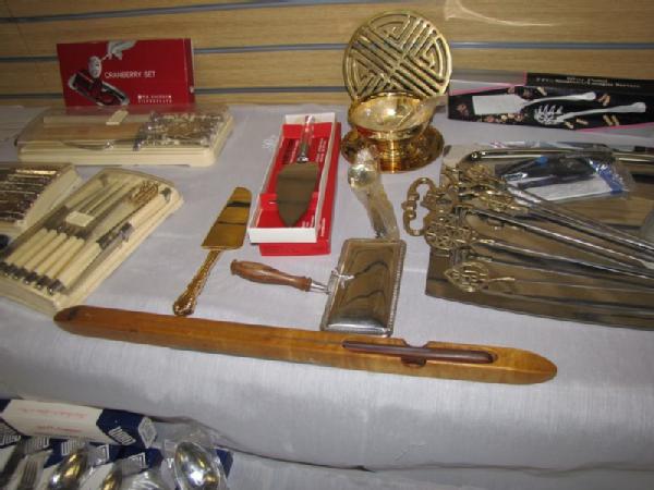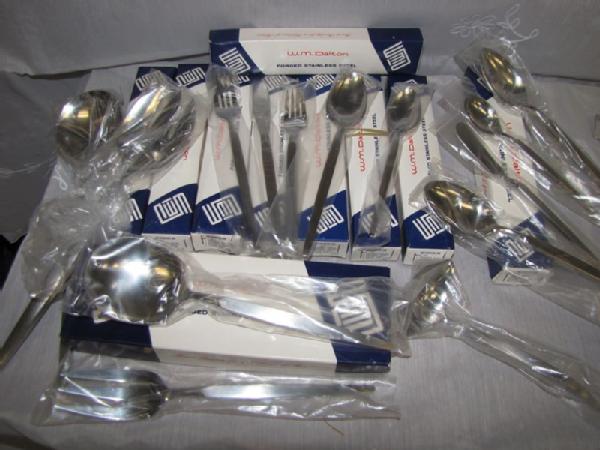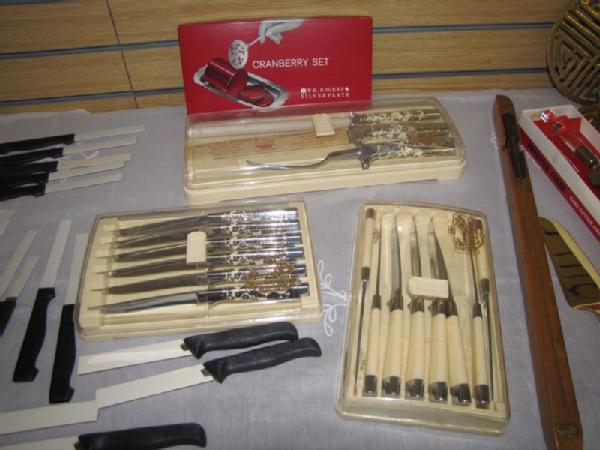 Flatware, carving sets, knives, etc. including new 49 piece set of W.M. Dalton stainless steel Windrim pattern flatware including service for 8 (2 forks, knife, 2 spoons per set) plus 9 serving pieces; new set of Lifetime Stainless flatware 50 piece service for 8; vintage Carvel Hall steak knives and carving set; long Case carving knife in wooden holder with sharpening stone; Italian crumb sweeper; vintage W.M. Rogers Cranberry Set in the box; etc.