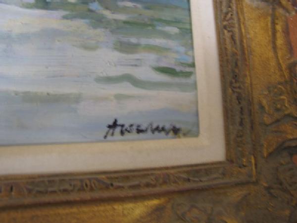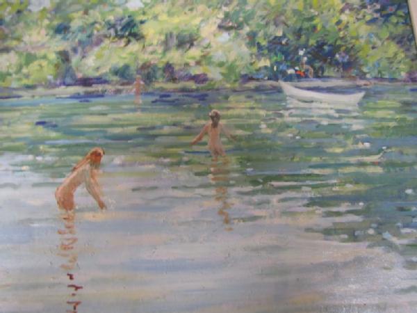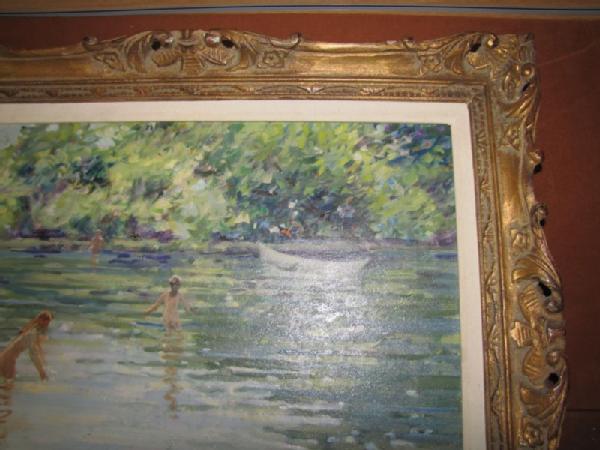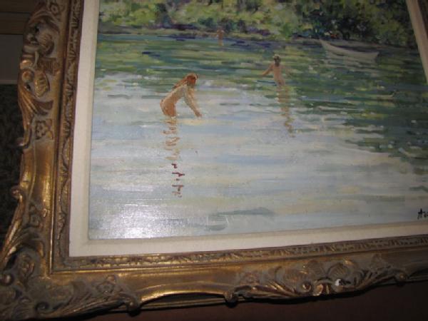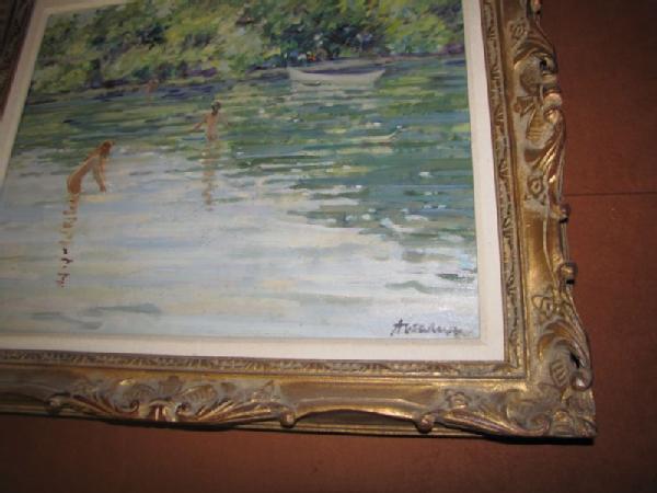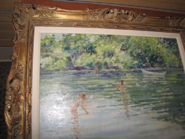 Albert Werner (German 20th c.) signed framed oil on canvas painting of nude women in lake 15.5"Tx19.5"W