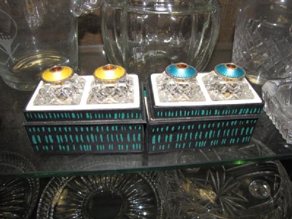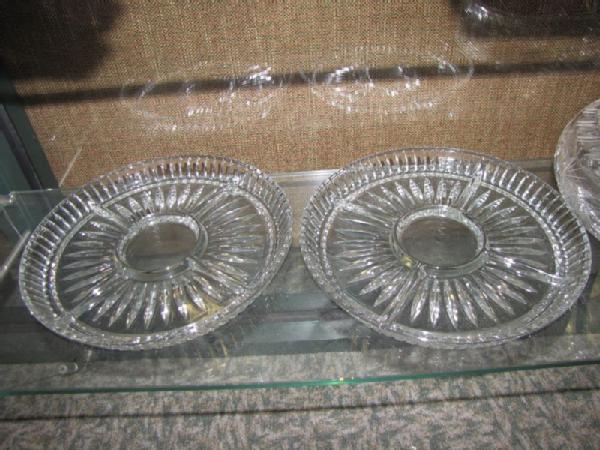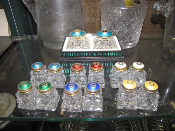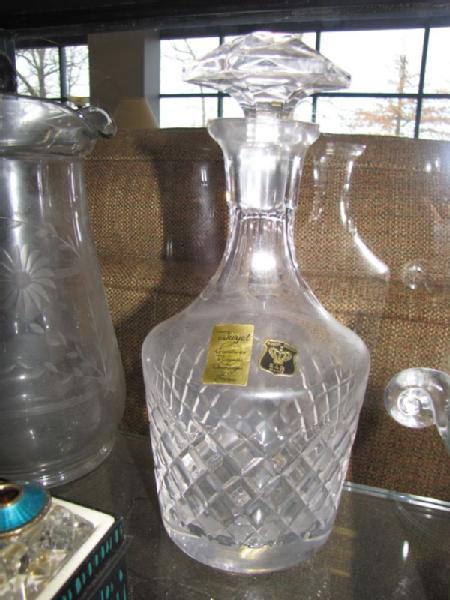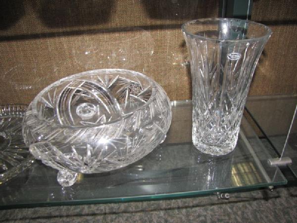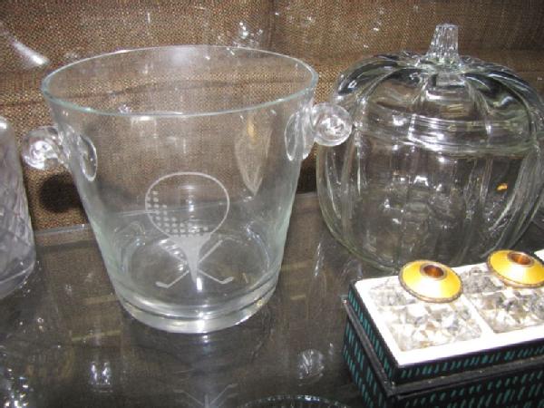 Crystal and glass items including 3 sets of Norway Crown Jewelry crystal salt/pepper shakers with enamel tops; 6 sets of small crystal salt/pepper shakers with enamel tops; Bayel lead crystal decanter from France; ice bucket with etched golf design; lidded pumpkin canister; two water pitchers; 9.25"T SamObor Kristel vase made in Croatia; 11"W crystal footed bowl (chip on inside rim); 3 divided glass serving pieces, etc.