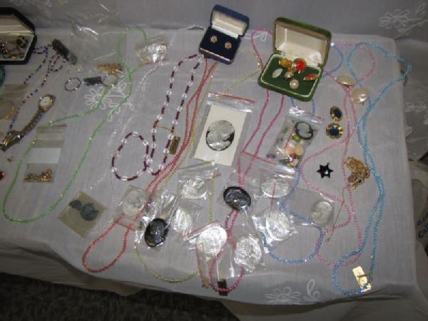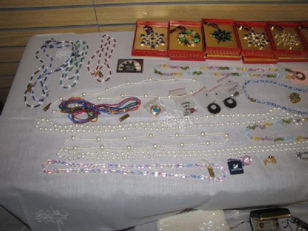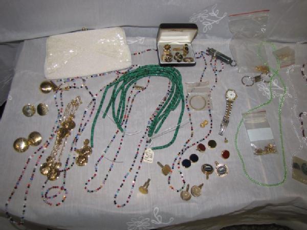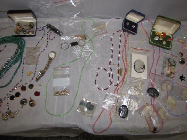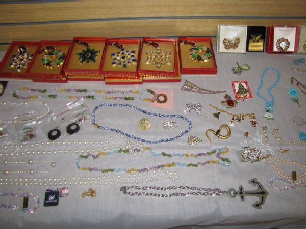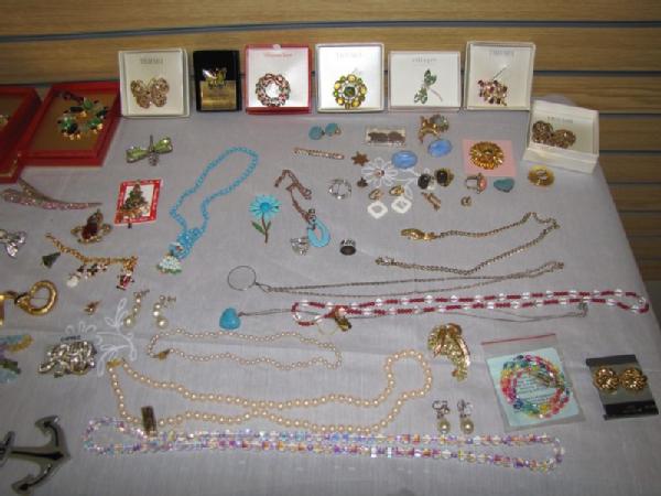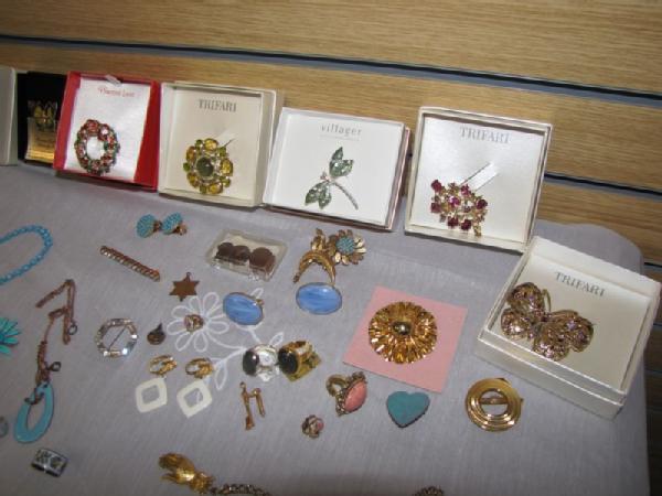 Misc. costume jewelry & ornaments including numerous glass and crystal necklaces; strings of green stones labeled Malakite rondel; vintage cufflinks; Trifari brooches in boxes; faux pearls; rhinestone items; Liz & Co. ornaments; etc.