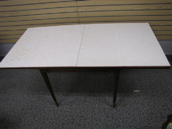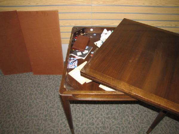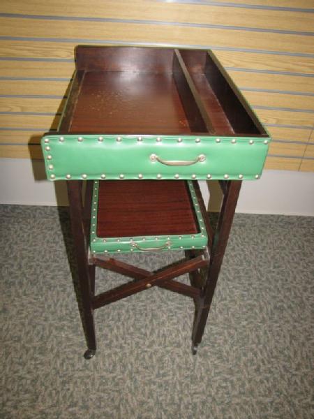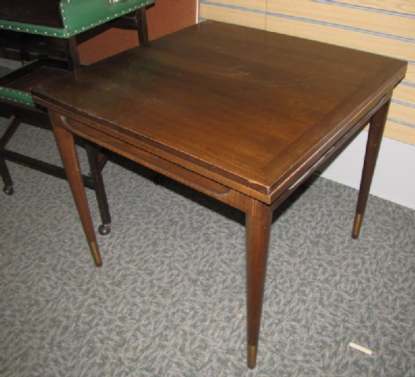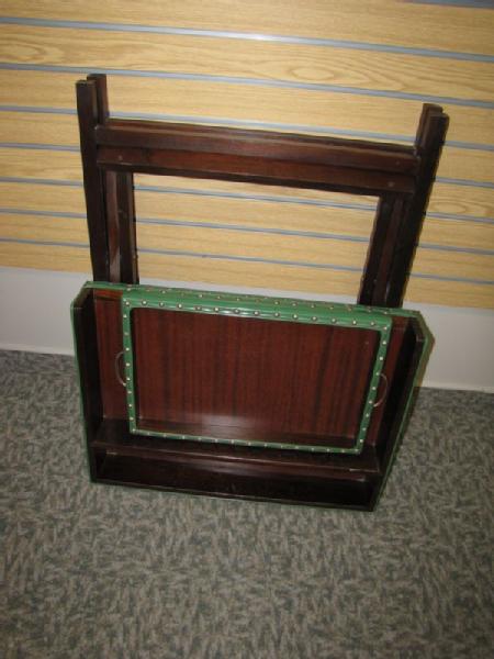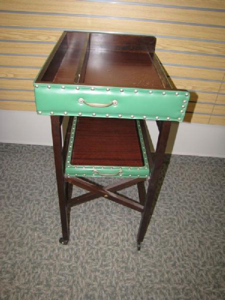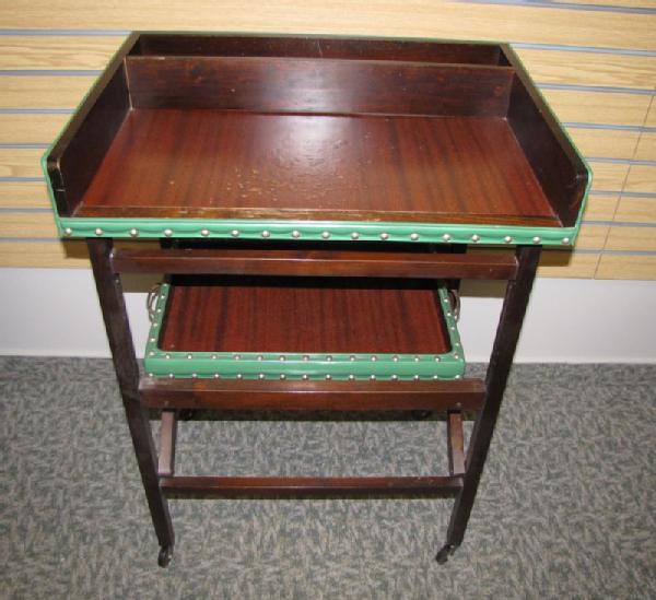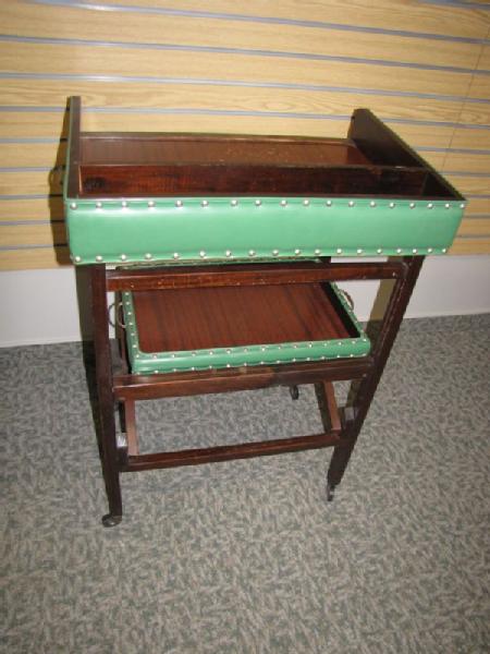 Gaming table and portable bar. Mid 20th C. swivel top table 29"Tx32"square, labeled NC John Stuart New York Grand Rapids. Hinged top swivels and folds out to 64"L. Has internal storage. Includes table pads. Rolling bar is 37"Tx26.25"Wx19"D and has two removable serving trays, folds up for storage. Both pieces have finish wear.