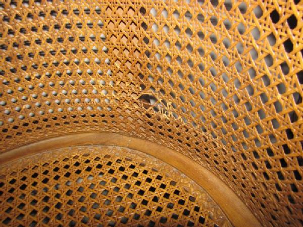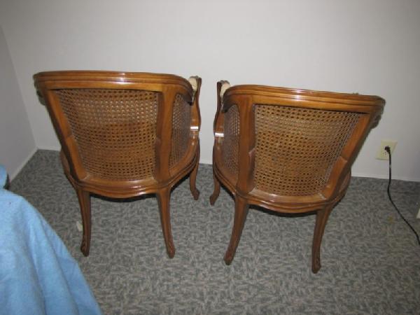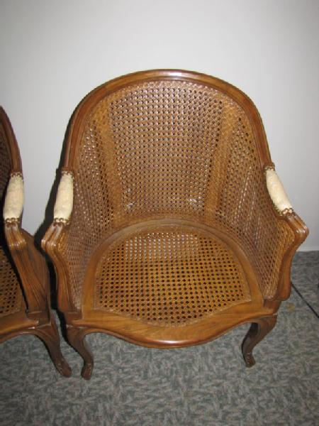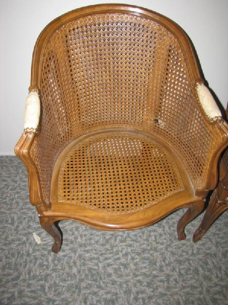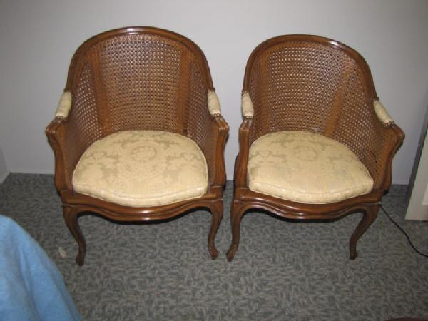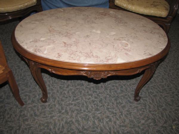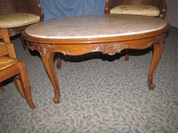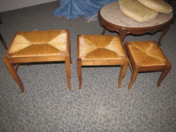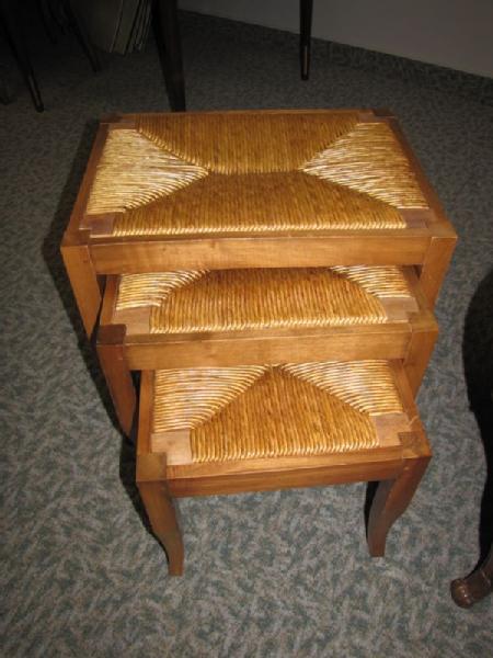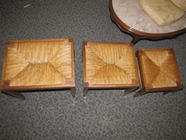 Marble top coffee table, 2 chairs and 3 rush seat nesting tables. Table is 17"Tx28"Dx38"W. Largest nesting table is 18"Tx20"Wx14.5"D. Chairs were made by Brunovan Inc, Bronx, NY. One chair has a small amount of damage to wicker back. Upholstery is faded.