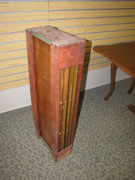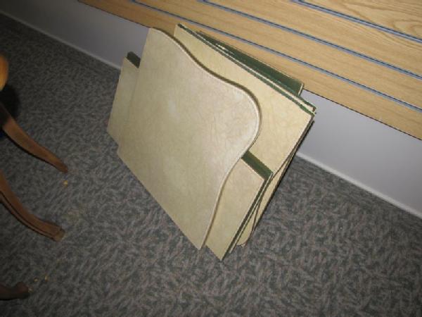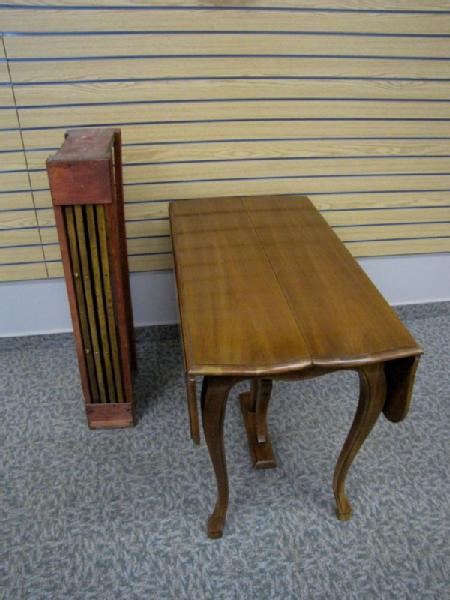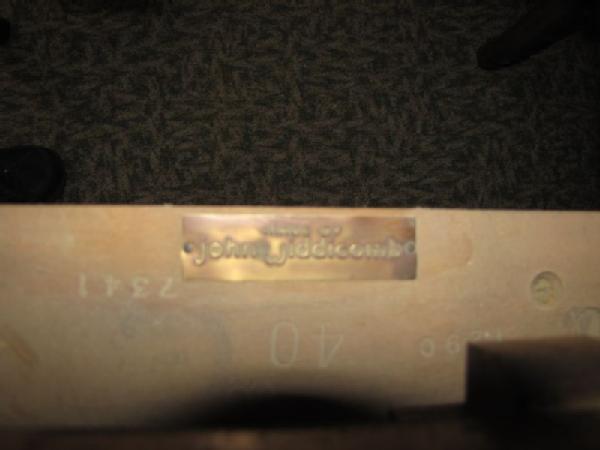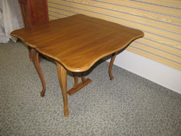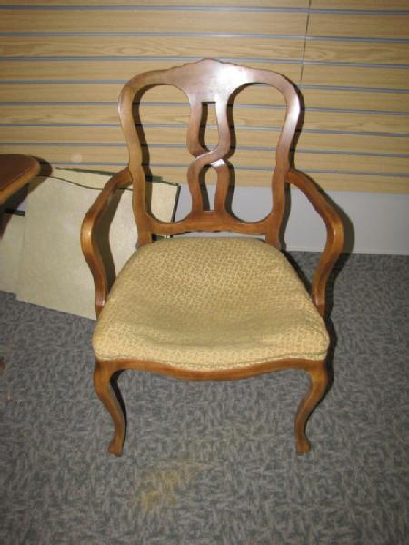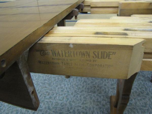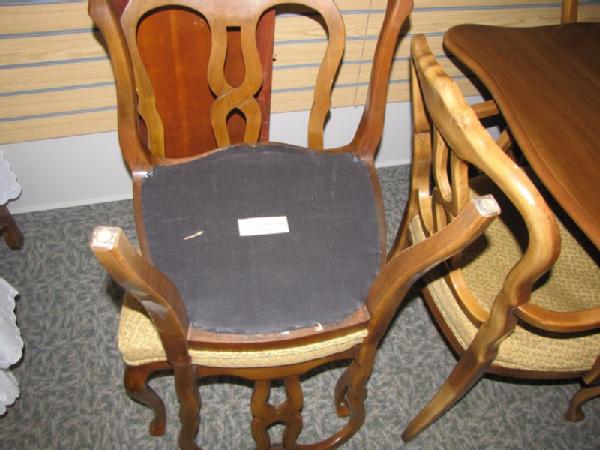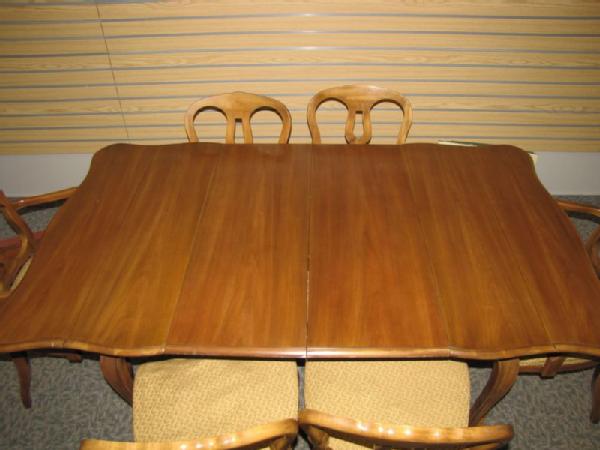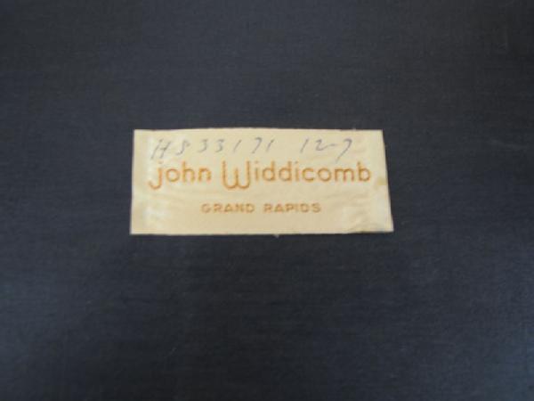 John Widdicomb dining room table, 8 chairs and table pads. Table includes four 13.5"W leaves. With 2 leaves installed, table is 29"Tx39"Dx66"W. There are 4 side chairs and 2 arm chairs. Wood has some blemishes. Chair foam seats are deteriorating and will need reupholstering.