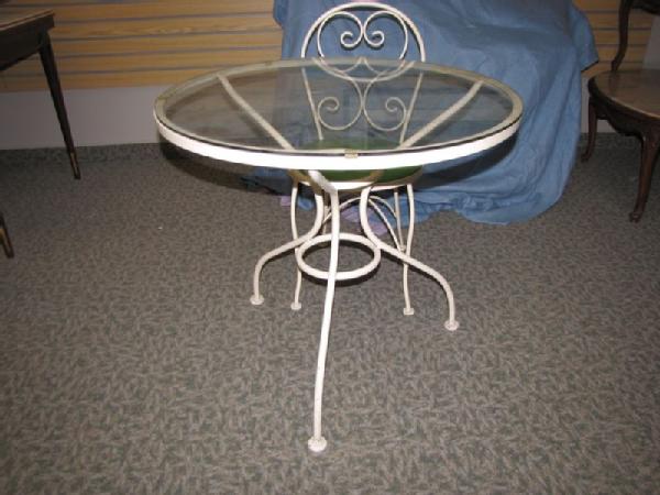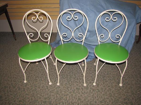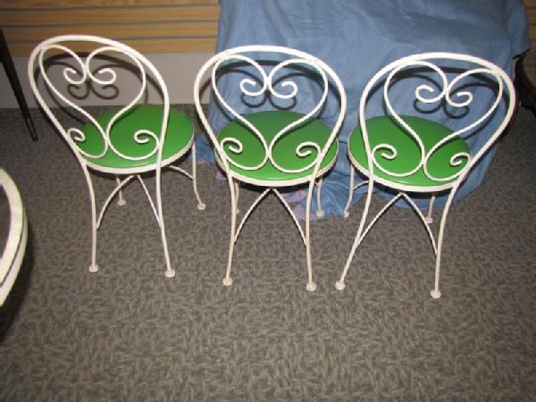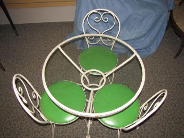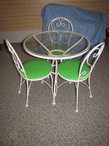 Ice cream parlor style table and chair set including round glass top table with white painted steel frame 28"Tx30"W; 3 chairs, ea. 33"T, with white painted steel frames and green vinyl upholstered seats. Some paint chips observed.