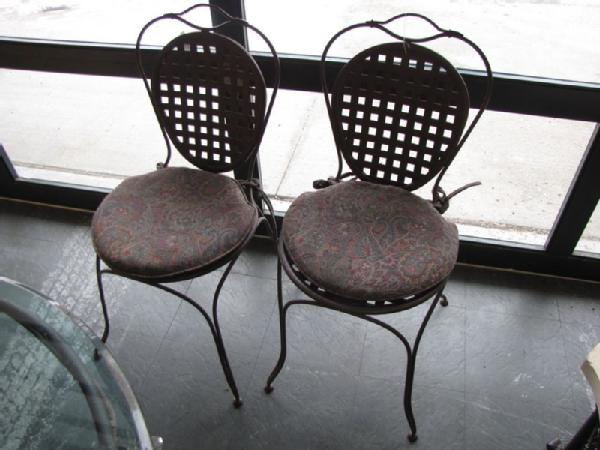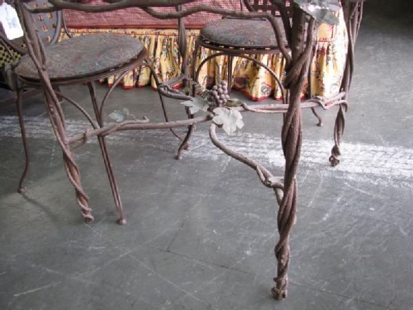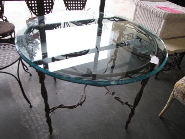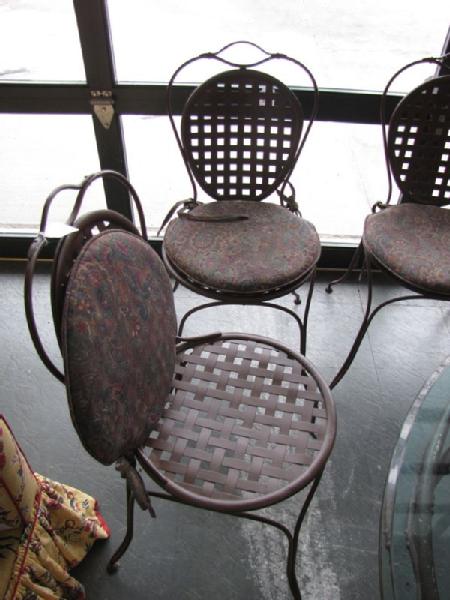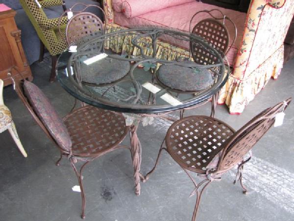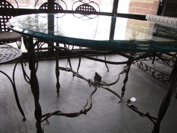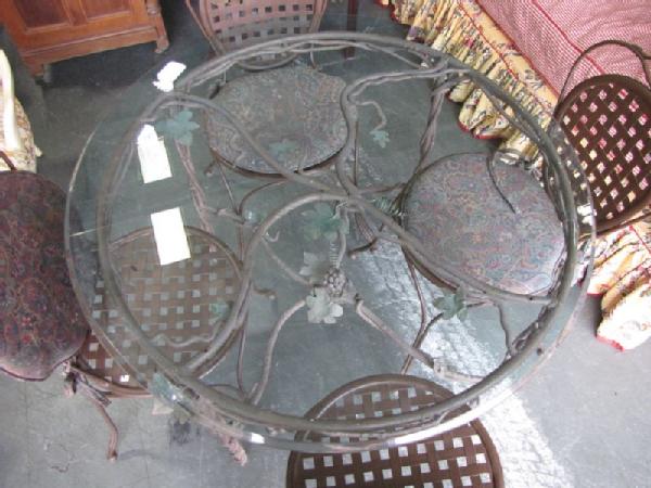 Wrought iron glass top table with painted metal grapevine design, 4 chairs with cushions. Table is 29"Tx40"W. Other items appearing photos not included.