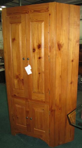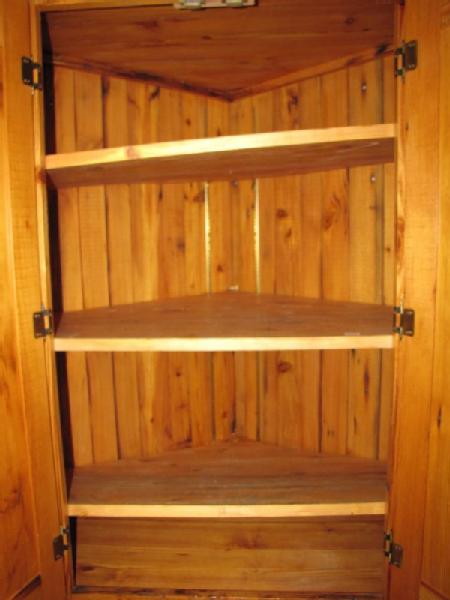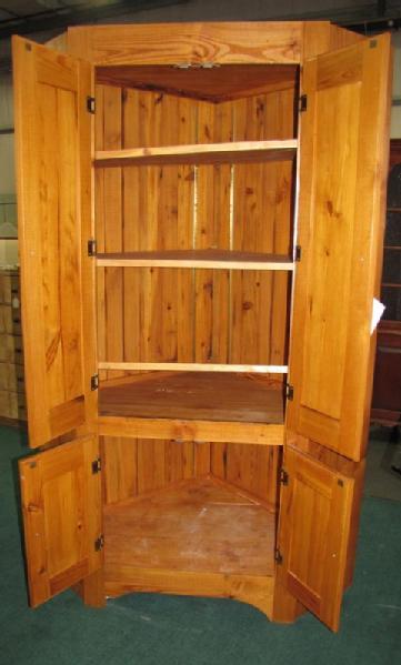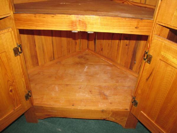 Pine corner cabinet with adjustable shelves, 87"Tx56"Wx40"D. Other items appearing photos not included.