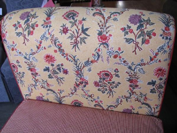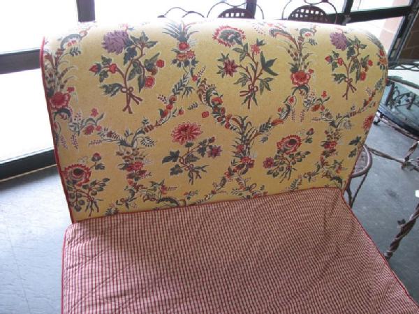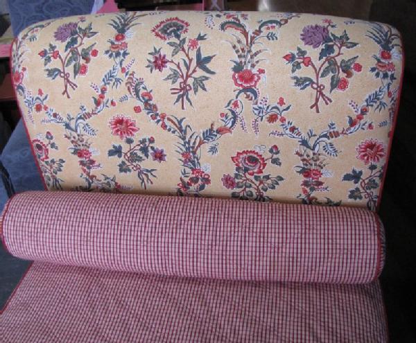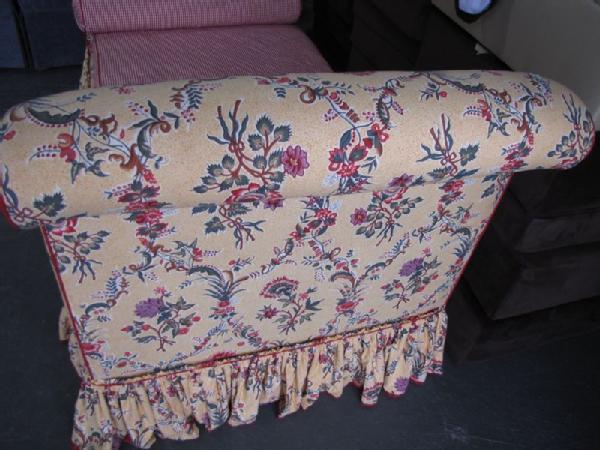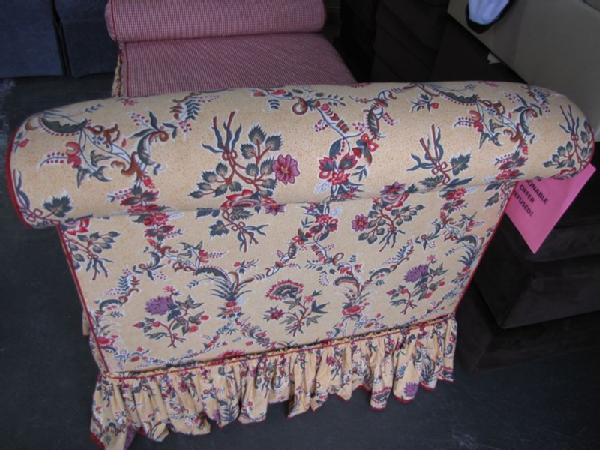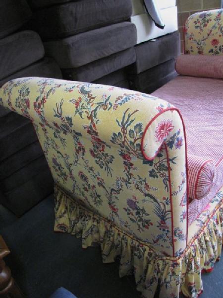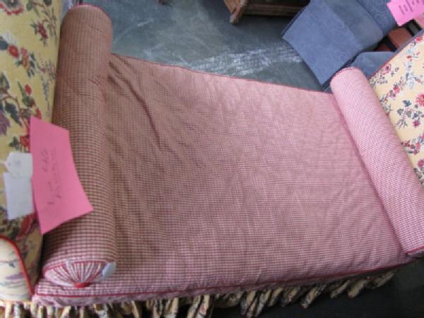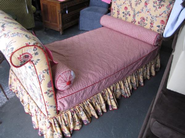 French upholstered day bed with yellow upholstery decorated with red flowers & red ticking, 43"Tx84"Wx38"D