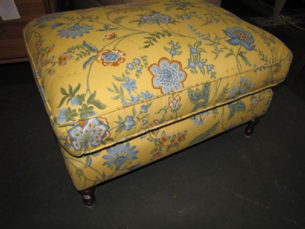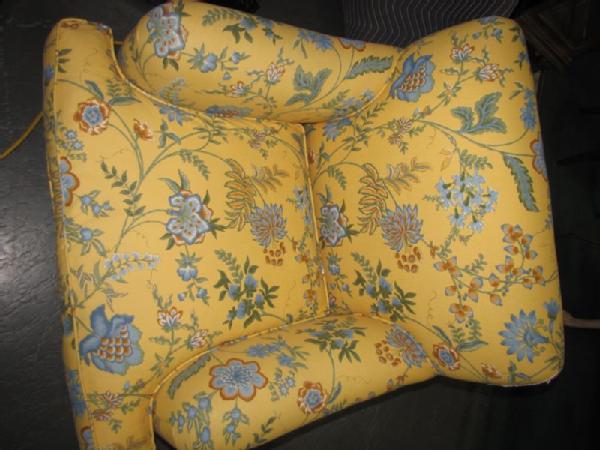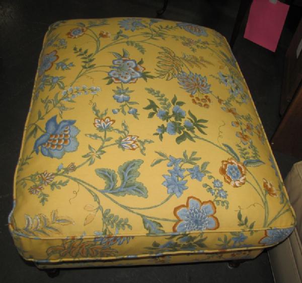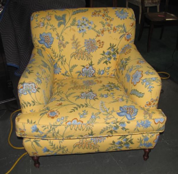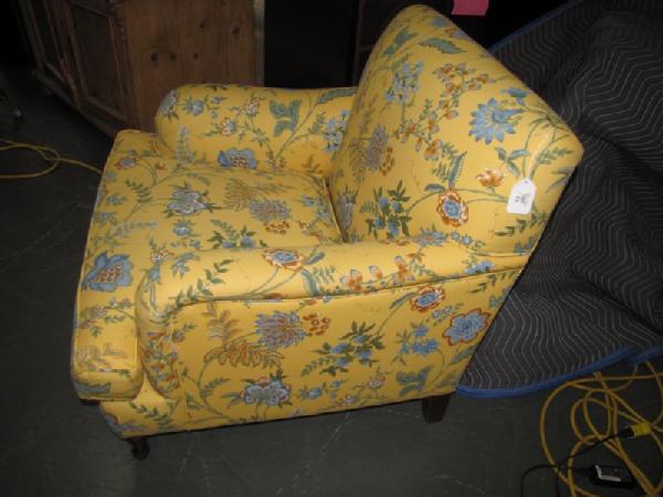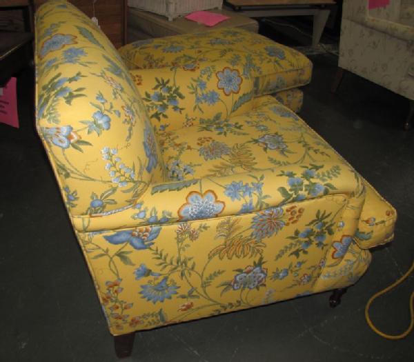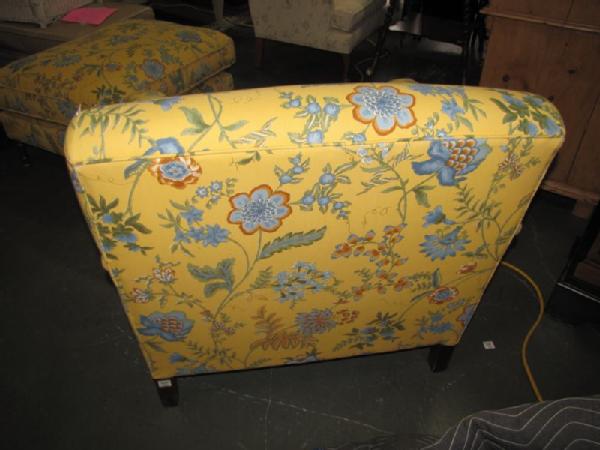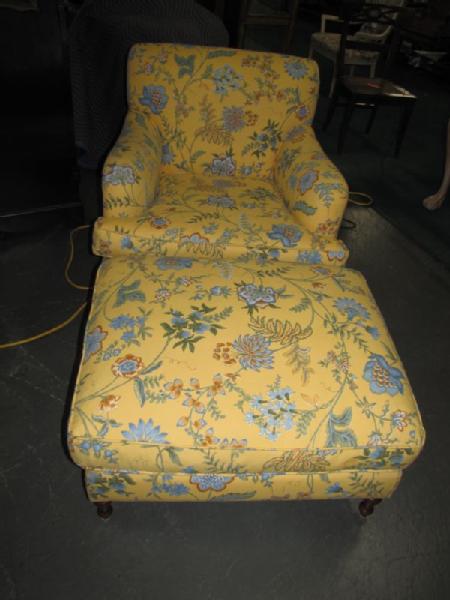 Yellow floral upholstered club chair with ottoman. Other items appearing photos not included.