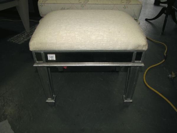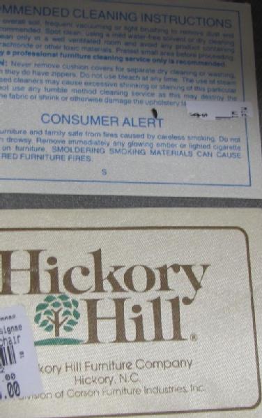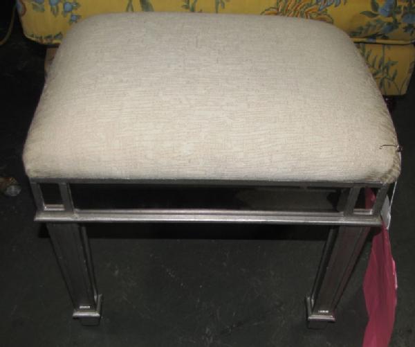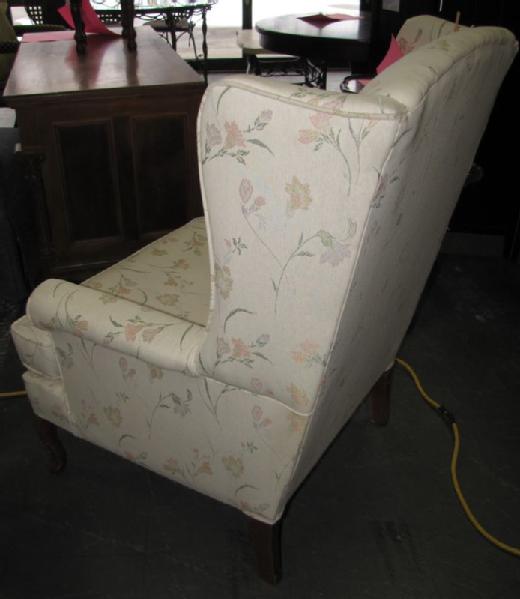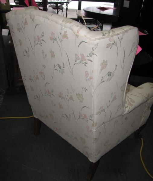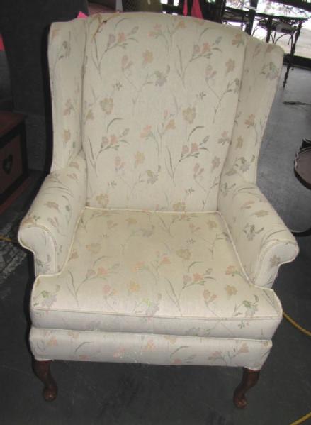 Chair and footstool including Hickory Hill brand wing back chair, beige with light floral print; silver foot stool with mirrored base and beige cushion. Other items appearing photos not included.