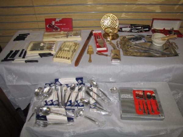 Flatware, carving sets, knives, etc. including new 49 piece set of W.M. Dalton stainless steel Windrim pattern flatware including service for 8 (2 forks, knife, 2 spoons per set) plus 9 serving pieces; new set of Lifetime Stainless flatware 50 piece service for 8; vintage Carvel Hall steak knives and carving set; long Case carving knife in wooden holder with sharpening stone; Italian crumb sweeper; vintage W.M. Rogers Cranberry Set in the box; etc.
