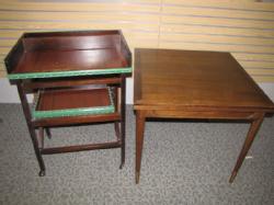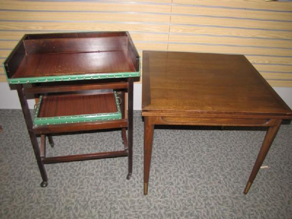Gaming table and portable bar. Mid 20th C. swivel top table 29"Tx32"square, labeled NC John Stuart New York Grand Rapids. Hinged top swivels and folds out to 64"L. Has internal storage. Includes table pads. Rolling bar is 37"Tx26.25"Wx19"D and has two removable serving trays, folds up for storage. Both pieces have finish wear.