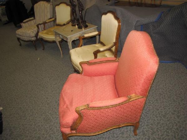 Living room furniture including 4 vintage Bodart upholstered chairs with carved wooden frames; French Provincial table; 2 figural Barbara Baldwin soldier lamps (figures are 20"T, one has damage). Fabric has wear and fading.