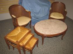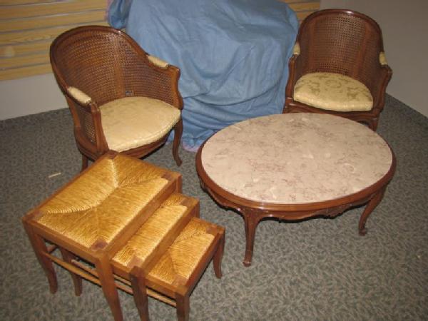 Marble top coffee table, 2 chairs and 3 rush seat nesting tables. Table is 17"Tx28"Dx38"W. Largest nesting table is 18"Tx20"Wx14.5"D. Chairs were made by Brunovan Inc, Bronx, NY. One chair has a small amount of damage to wicker back. Upholstery is faded.