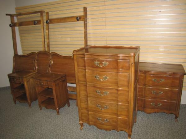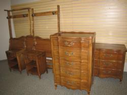 Mid 20th C. John Widdicomb French style bedroom furniture including 80"W King headboard with two twin frames; 2 night stands 28"Tx20"Wx15"D; 50"Tx33"Wx20"D dresser; 35"Tx65"Wx21"D dresser. All pieces have finish wear.