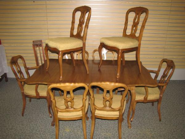 John Widdicomb dining room table, 8 chairs and table pads. Table includes four 13.5"W leaves. With 2 leaves installed, table is 29"Tx39"Dx66"W. There are 4 side chairs and 2 arm chairs. Wood has some blemishes. Chair foam seats are deteriorating and will need reupholstering.