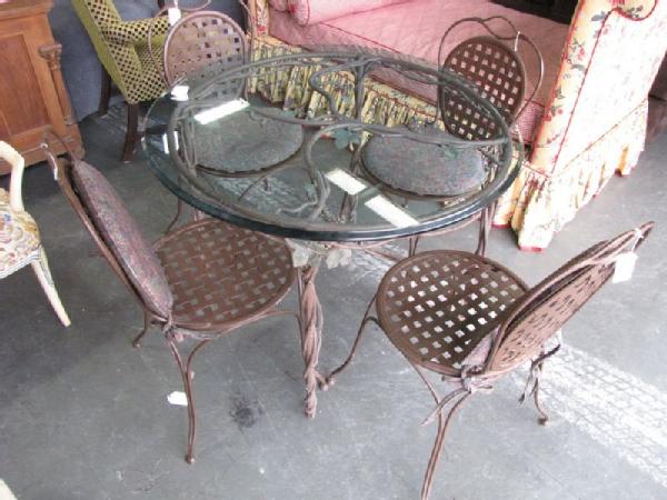 Wrought iron glass top table with painted metal grapevine design, 4 chairs with cushions. Table is 29"Tx40"W. Other items appearing photos not included.