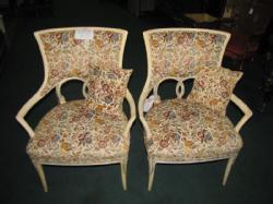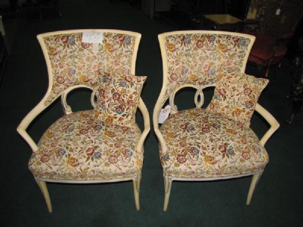 2 French style armchairs with white painted wooden frames having blue highlights and needlepoint upholstery/pillows. 37"Tx27.5"Wx22"D. Other items appearing photos not included.