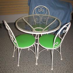 Ice cream parlor style table and chair set including round glass top table with white painted steel frame 28"Tx30"W; 3 chairs, ea. 33"T, with white painted steel frames and green vinyl upholstered seats. Some paint chips observed.