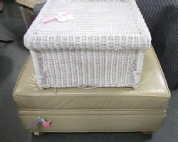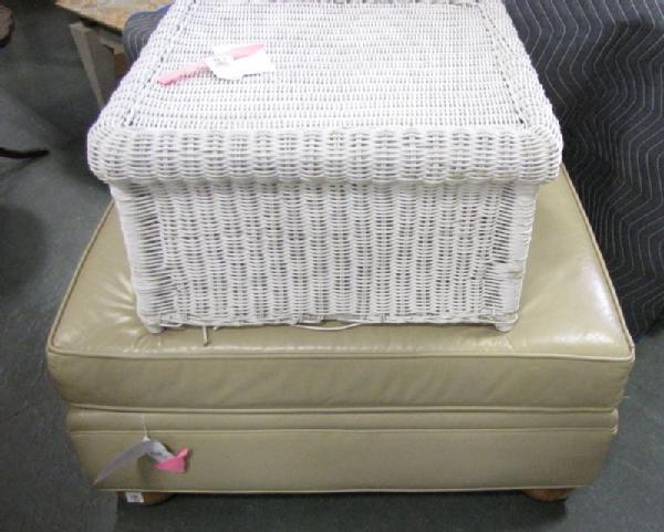 White wicker hassock & large tan leather ottoman. Other items appearing photos not included.