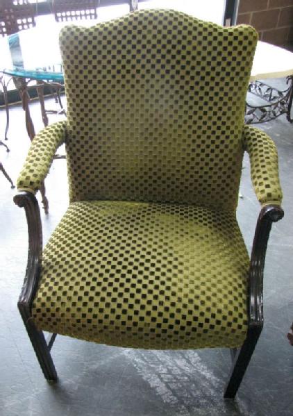Green upholstered armchair with wood frame 38"Tx26"Wx26"D. Other items appearing photos not included.