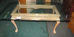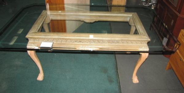 Modern dining room table with beveled glass top, carved wooden base and ball/claw feet, 32"Tx48Wx80"L. Other items appearing photos not included.