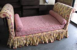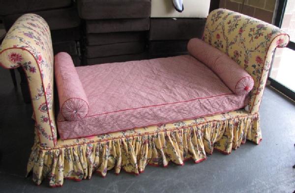 French upholstered day bed with yellow upholstery decorated with red flowers & red ticking, 43"Tx84"Wx38"D