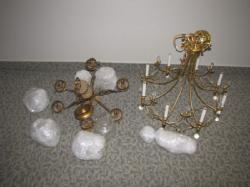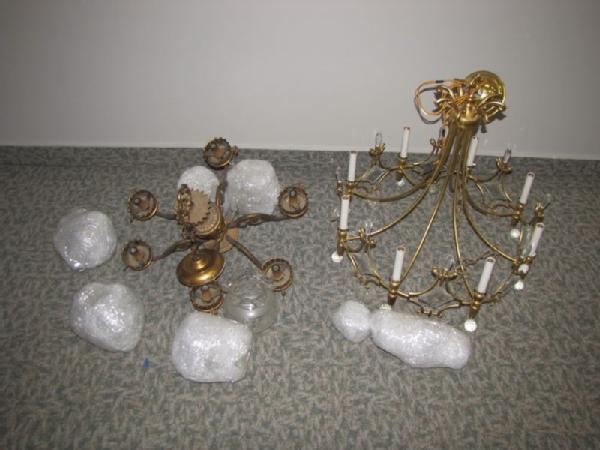 2 vintage brass chandeliers including brass & crystal chandelier 25"Wx25"T & brass chandelier with fancy glass chimneys 24"W.