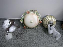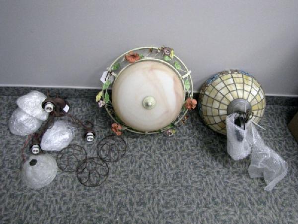 Designer light fixtures including Tiffany style hanging light, three globe metal chandelier & floral dome light.