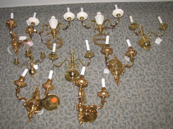 Designer lighting including 2 brass & ceramic sconces; brass candleholder; 6 brass electric sconces
