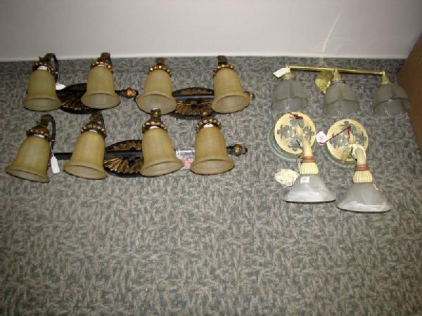 Designer lighting including 4 light wall light fixture (one glass shade damaged), two 2 light wall sconces, brass 3 light wall sconce & pair of yellow floral wall sconces.
