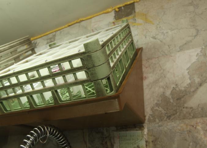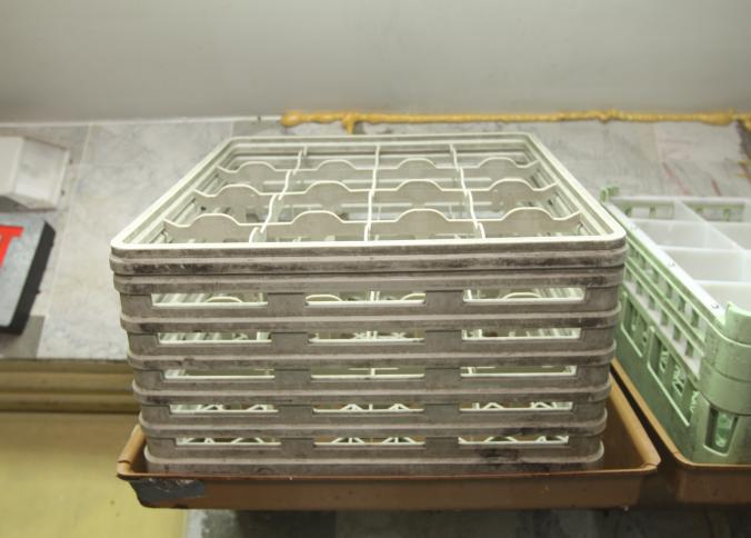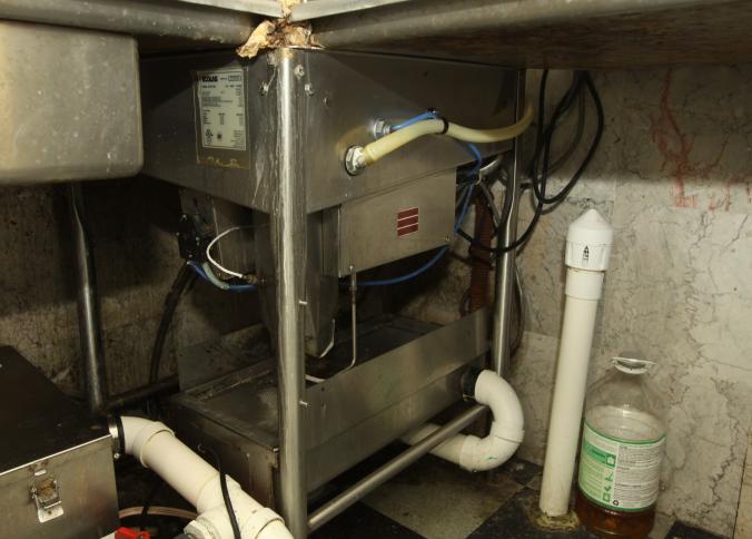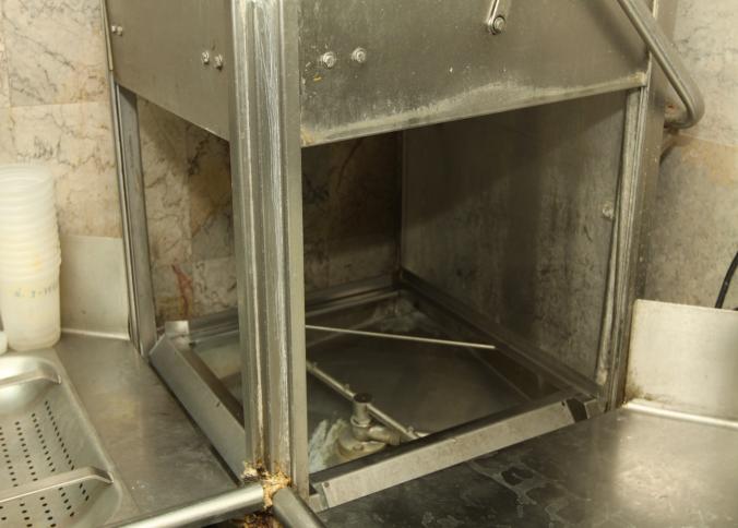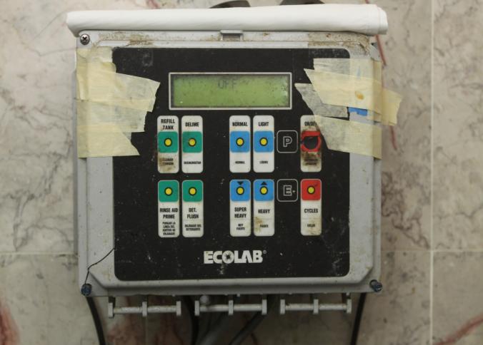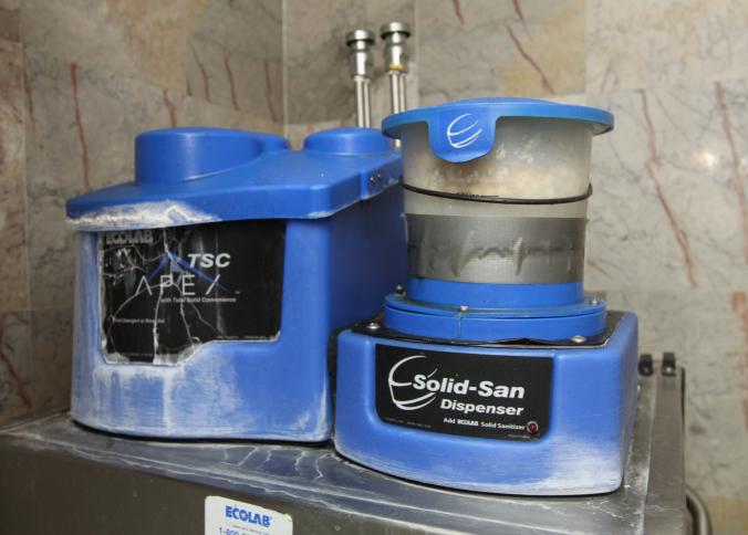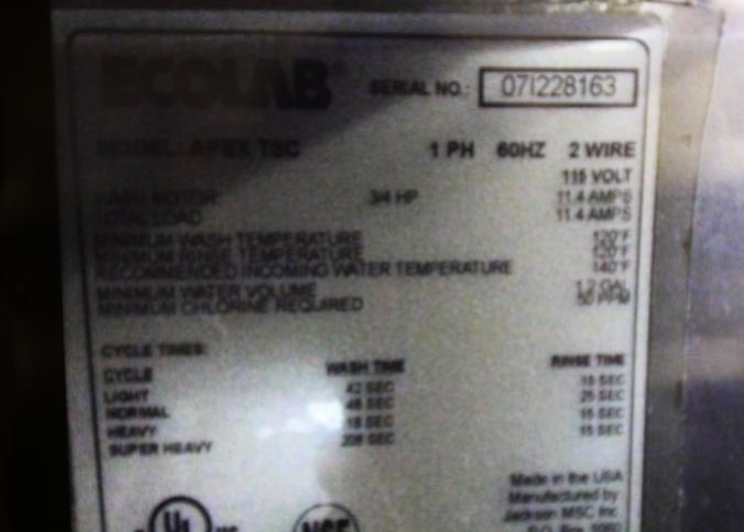 Ecolab stainless steel dishwasher model Apex TSC serial number 071228163, 25.5" square x approx. 74" tall, also incl dish racks, rack holder, soap dispensers, and electronic control. In working condition, still in use. Buyer is responsible for proper and safe removal to the first disconnect incl capping of any necessary lines.