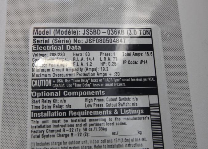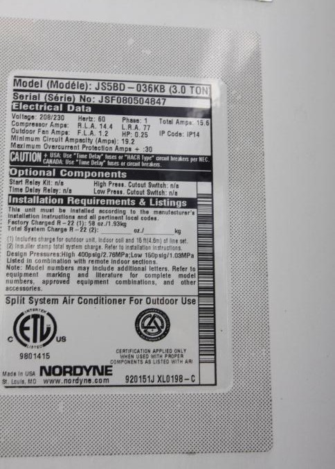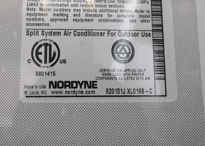 NorDyne split system air conditioner model JS5BD-036KB (3.0 Ton) serial number JSF080504847 with approx. 25' of round duct pipe. Owner reports in working condition. Buyer is responsible for proper and safe removal to the first disconnect incl capping of any necessary lines, bringing all necessary tools and equipment. Outside unit is mounted on top of the walk in cooler and will need to be unwired. Does not include breaker box.