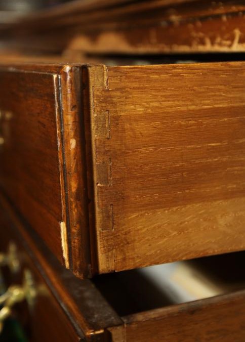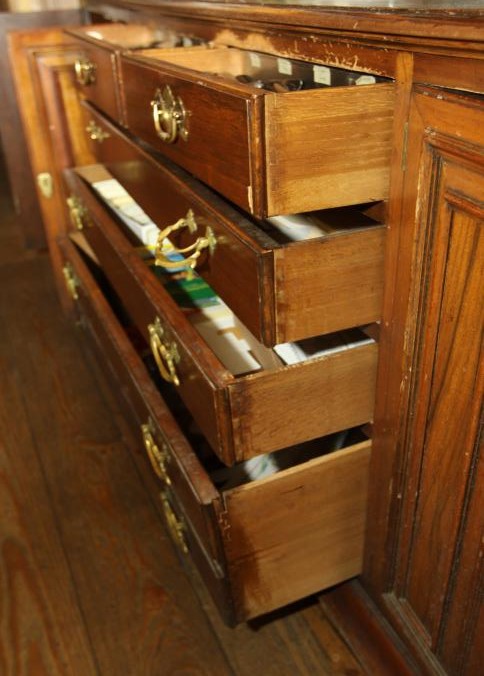 Sideboard with four doors, six drawers, carved panel decoration, dovetail construction, metal hardware. 93" x 20" x 35" tall. Excluding contents and other lots.